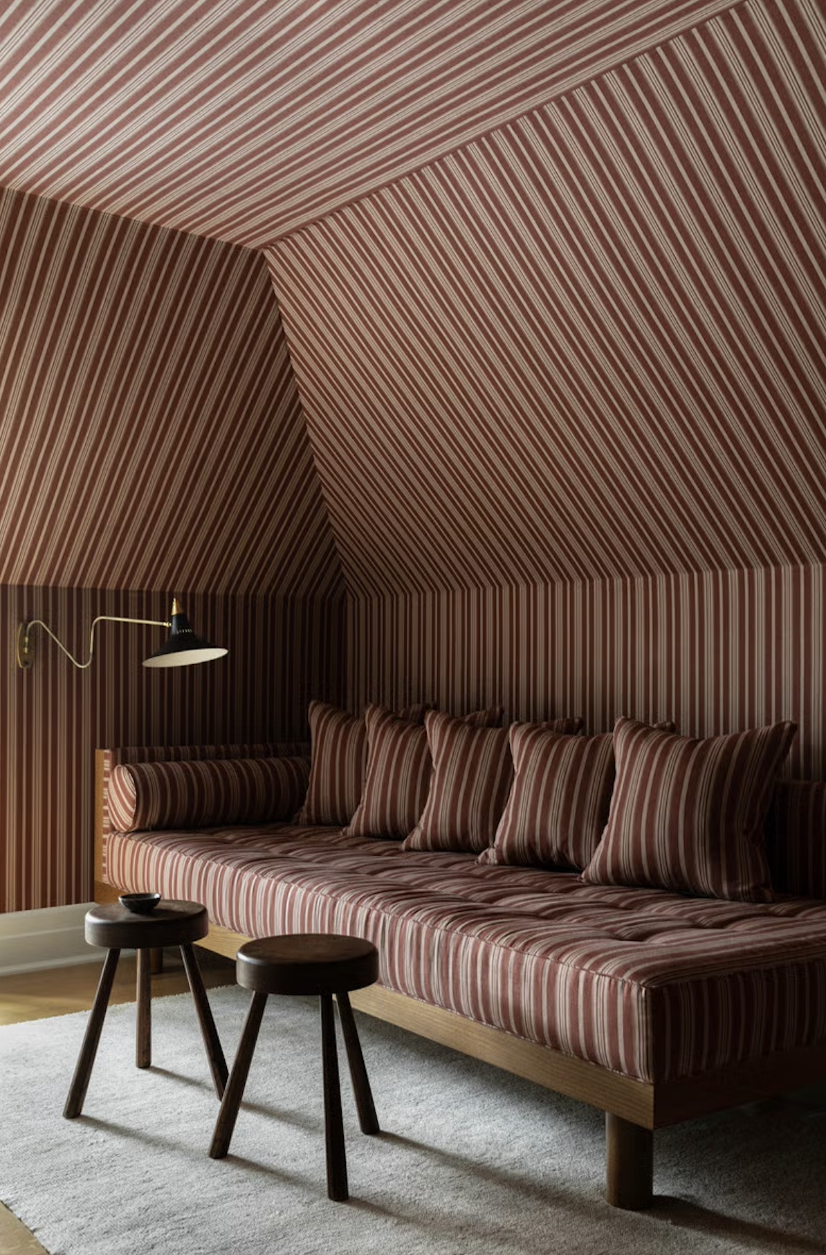 In this compact bedroom, a rare 19th-century burled birch sleigh bed brings historical refinement to a space of quiet, modern restraint.